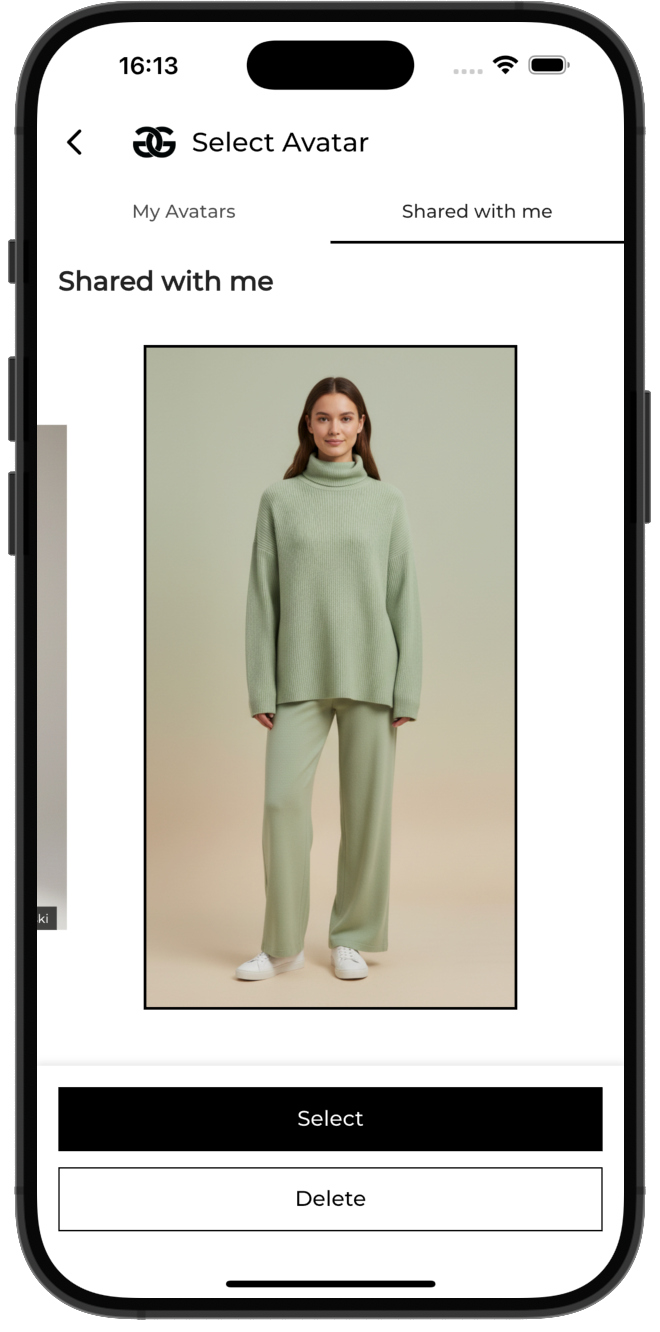 The client shares her avatar and wardrobe with you. You see exactly what she owns. You build outfits from her clothes. You send ready stylizations directly to her app. She tries them on her avatar. Approval with one tap.