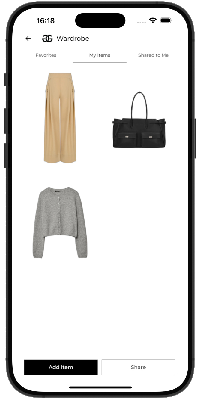 The client shares their digital wardrobe with you — every item scanned, catalogued, ready to use. You see colours, cuts, brands. You create outfits from things that actually sit in their wardrobe. You don't invent — you create.